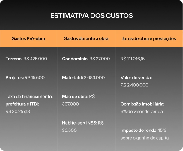 Depois de descobrir exatamente onde e o que iremos construir, precisamos calcular na ponta do lápis os custos deste investimento e simular cenários. Fazemos justamente para garantir que o investimento seja lucrativo, financeiramente viável para o nosso bolso e pouco arriscado. Vamos aos exemplos: